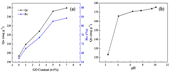 Effects of (a) GO content and (b) solution pH on the methylene blue (MB) adsorption.