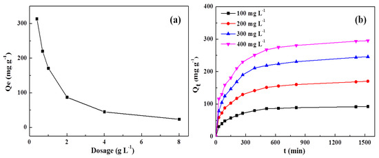 The effect of DN hydrogel dosage on the adsorption was examined by soaking different amounts of hydrogels into 25 mL of MB solution with a concentration of 200 mg·L−1. As can be seen from Figure 8a, the equilibrium adsorption capacity of DN hydrogels for MB was decreased with increasing the dosage of DN hydrogels. When the dosages of DN hydrogel were changed from 0.5 to 8 g·L−1, the equilibrium adsorption capacities were reduced from 313.09 to 23.09 mg·g−1. For a certain amount of MB solution, DN hydrogels with lowered dosages would readily reach a saturation adsorption state due to the limited adsorption active points in DN hydrogels [34]. However, when increasing the dosage of DN hydrogels, the adsorption active points were in an unsaturated adsorption state, resulting in lowered adsorption capacities. The optimum adsorbent dosage was determined to be 1.00 g·L−1 for MB.