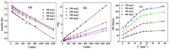 (a) Pseudo-first-order plots, (b) pseudo-second-order plots, and (c) intraparticle diffusion plots for MB adsorption.