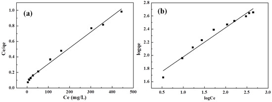 where qe and ce are the equilibrium adsorption capacity (mg·g−1) and equilibrium concentration (mg·g−1), respectively. qm is the maximum adsorption capacity (mg·g−1) and KL is the rate constant of Langmuir adsorption isotherm.