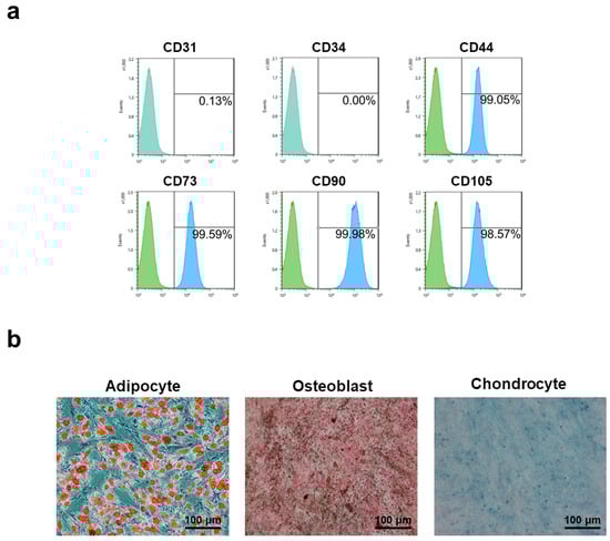 Characterization of adipose-derived mesenchymal stem cells (AD-MSCs) used for experiments. (a) Positive markers for CD44, CD73, CD90, and CD105, negative markers for CD31 and CD34; (b) Staining for multilineage differentiation of AD-MSCs.