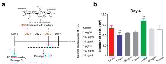 Investigation of optimal hexanoyl glycol chitosan (HGC) concentration. (a) experimental scheme; (b) cell number of AD-MSCs at day four (passage 5); ** p < 0.01 relative to the control; (c) cell morphology and density of the control and 1 μg/mL of HGC at day four (passage 5); (d) Comparison of population doubling time at passage 5 (the control) and the control and 1 μg/mL of HGC group at passage 10.