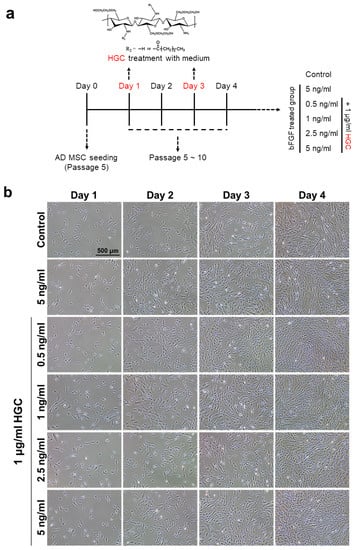 hAD-MSCs (ATCC, Manassas, VA, USA) were seeded at the density of 4500 cell/cm2 on polystyrene tissue-culture dishes and cultured in Minimum Essential Medium α-modification (α-MEM; Thermo Fisher Scientific) including GlutaMAX, supplemented with 10% fetal bovine serum (FBS; Thermo Fisher Scientific), 1% of penicillin-streptomycin (P/S; Thermo Fisher Scientific), and HGC and/or basic fibroblast growth factor at the indicated concentration. Cells were maintained at 37 °C in a humidified atmosphere containing 5% CO2. The culture medium was changed every two days, and cells were cultured to ~90% confluence in the culture medium as above. When −90% confluence was reached, after four days of culture, expanded cells were detached using 0.25% trypsin-EDTA (Thermo Fisher Scientific). Then, collected cells were centrifuged at 1000 rpm, 5 min, and cells were seeded at a density of 4500 cells/cm2. Subsequently, every cell was passaged at ~90% confluence until passage 10.