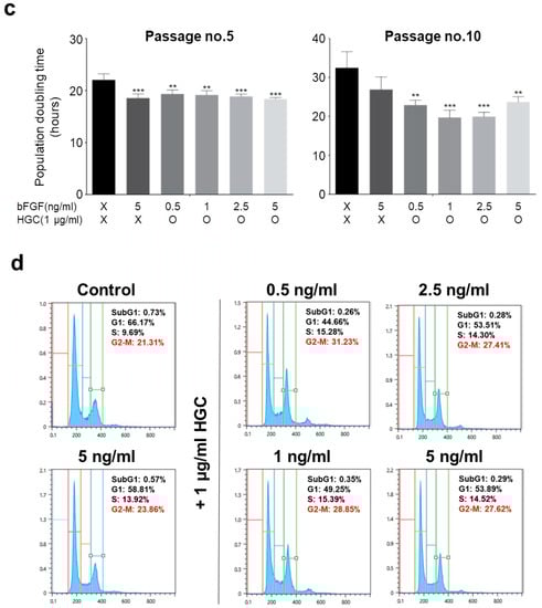 Comparison of proliferative capacity between HGC combined with basic fibroblast growth factor (bFGF) groups and non-treated groups. (a) Experimental scheme following various concentration of bFGF treatment with 1 μg/mL of HGC; (b) Daily incubated cell morphology picture of AD-MSCs at passage 5; (c) Population doubling time at passages 5 and 10; and (d) cell cycle analysis. ** p < 0.01, and *** p < 0.001 relative to the control.