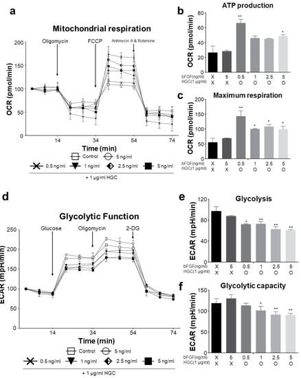The analysis of metabolic functionality of AD-MSCs at passage 10. (a) The measurement of oxygen consumption rate following oligomycin, FCCP, antimycin A, and rotenone treatment; (b) ATP production; (c) maximum respiration; (d) The measurement of extracellular glycolytic acidification following glucose, oligomycin, and 2-DG treatment. Glycolytic function displayed an increased extracellular acidification rate in control and 5 ng/mL bFGF-only treated group; (e) glycolysis and (f) glycolytic capacity. * p < 0.05 and ** p < 0.01 relative to the control. FCCP: carbonyl cyanide-4 (trifluoromethoxy) phenylhydrazone, 2-DG: 2-deoxy-glucose.