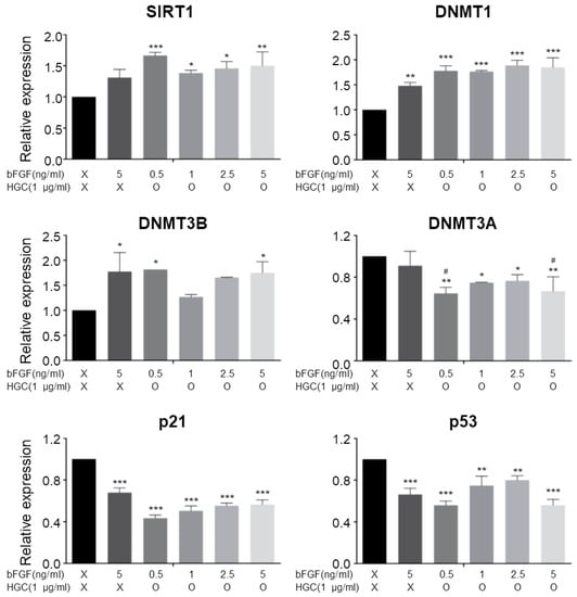 In order to verify whether stimulation of AD-MSCs growth by the HGC/bFGF combination treatment is correlated with gene expression of cellular senescence, we assessed SIRT1, DNMT1, DNMT3B, DNMT3A, p21, and p53 mRNA levels by using quantitative real-time PCR (Figure 6). The expression of Sirtuin 1 (SIRT1) was significantly up-regulated in cells treated with HGC, especially for the 0.5 ng/mL of bFGF group. Analysis of the expression of DNA methyltransferases (DNMTs) revealed that DNMT1 and DNMT3B extensively increased more for all bFGF-treated groups than for the control. In contrast, DNMT3A, which participates in the new methylation, was down-regulated in the HGC-treated groups. Additionally, both p21 and p53 were down-regulated in all bFGF-treated groups more than in the control. Especially, 0.5 ng/mL of bFGF with HGC displayed the most significant down-regulation. Altogether, these data indicate that the HGC/bFGF combination treatment may contribute to regulating the cellular senescence of AD-MSCs.