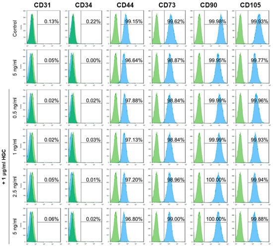 In order to confirm whether the characteristics of AD-MSCs were maintained after five passages with HGC treatment in vitro, we analyzed cell-surface marker expression by flow cytometry for each group at passage 10. All groups expressed CD44, CD73, CD90, and CD105 with an average of >95% for positive markers and lack of CD31 and CD34 for negative markers (Figure 7), which demonstrates the stability of the CD profile of AD-MSC after long-term culture with HGC. Furthermore, we investigated the multilineage differentiation capacity of each group at passage 10 (data not shown). We found that all groups were well differentiated into osteoblasts, adipocytes, and chondrocyte as confirmed by von kossa, Oil Red O, and Alcian blue staining, respectively.