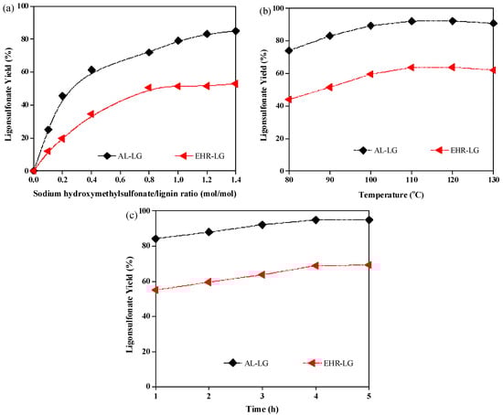 Firstly, it can be observed from Figure 1a that increasing the ratio of sodium hydroxymethylsulfonate/lignin lead to increases in lignosulfonate production for both AL and HER. For AL, increasing the ratio from 0.1 mol/mol to 1.2 mol/mol resulted in an increase to lignosulfonate production from 25.1% to 83.1%. However, increasing the sodium hydroxymethylsulfonate addition from 1.2 to 1.4 mol/mol did not have an obvious effect on more lignin in AL been sulfonated, with an increase in yield of only 83.1% to 83.9%. For EHR, the optimum sodium hydroxymethylsulfonate/lignin ratio was 0.8 mol/mol, resulting 50.6% yield of lignosulfonate. The bottleneck of sulfomethylation reactions upon AL and EHR may be due to a finite amount of reaction sites (free C5 position) in each respective lignin [24]. Hence, it was speculated that sodium hydroxymethylsulfonate/lignin ratios with 1.2 mol/mol and 0.8 mol/mol were the optimum conditions for AL and EHR to produce lignosulfonates.