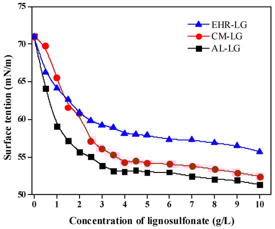 Figure 2. Surface tension of the lignosulfonates AL-LG, EHR-LG, and CM-LG in solutions of different concentrations.