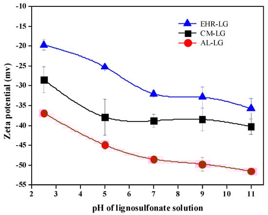 Zeta potentials of CM-LG, AL-LG, and EHR-LG solutions (0.5 g/L) were measured using a Nano-Zetasizer (ZSE, Malvern, UK). Specifically, the lignosulfonate powder was dissolved into solutions of different pH (2.5, 5.0, 7.0, 9.0, and 11.0). Next, 1 mL lignosulfonate solution was syringed into the electrophoresis cell. The zeta potential of each lignosulfonate solution was then measured after the solution in the electrophoresis cell was equilibrated for 60 s. Three replicates for each sample were performed, and the results reported are the average.