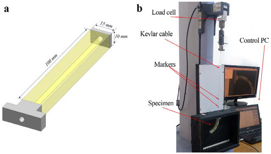 Printed actuators were mounted vertically into the fixtures, designed for the universal testing machine Shimadzu EZ-LX (Shimadzu Corporation, Kyoto, Japan), as shown in Figure 1b. Kevlar (DuPont, Wilmington, DE, USA) cable was passed through the cable channel and was connected to a small tablet at one of the ends of the specimen, while another end of the cable was tied to the top jig of the testing machine. During experiments, the top jig was moved up to retract the Kevlar cable, thus inducing deformation of the actuator. The actuator was deformed until an approximate 90 degree angle was reached, and then unloaded until zero force was measured on the load cell. The cable retraction length was measured by the vertical displacement of the top jig, while the whole actuation process was tracked by a CCD camera. In a series of experiments, we added dead weight on the free end of the actuators in order to estimate the actuator’s capacity to lift up additional weight. The force applied to the top jig and the retraction of the cable were measured during the experiments. Two small markers were placed on the cable in order to take into account the extension of the cable. However, the cable extension was negligible, since Kevlar has a very high Young’s modulus.