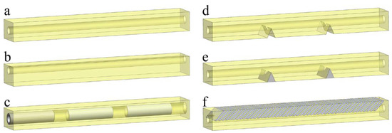 Geometry of the actuators with different channel positions and geometry. (a) Simple homogeneous actuator with central channel, (b) with shifted channel, (c) with stiff tubular inserts around channel, (d) with discrete notches, (e) with discrete stiff inserts, and (f) with periodic stiff inclusions structure. Shown colors are chosen to be similar to real colors of the 3D-printed materials. Yellow sections correspond to elastomeric material (TangoPlus, FLX9760 or FLX9785), while greyish inserts correspond to stiff VeroWhite material.