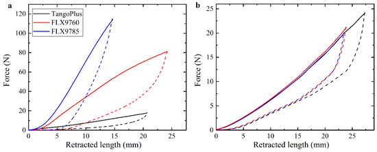 As mentioned in the materials and methods sections, three different materials were used to print the main part of the soft actuators, namely, TangoPlus (), FLX9760 (), and FLX9785 () [23]. Figure 3a shows the dependencies of the force, measured by load cell, on the retracted cable length. The dependencies, shown in Figure 3a, are obtained for the homogeneous actuator with a centered cable channel (Figure 2a). Clearly, the actuators printed with stiffer materials require higher forces to achieve the same level of deformation. This aspect should be taken into account in the case of engineering applications due to limited tensile strength of the cable or limited torque of the motor. Figure 3a also reveals that loading and unloading curves do not match each other, and a hysteresis loop is observed. This effect is caused by viscoelastic properties of base materials used in 3D printing [23]. Due to the delayed response of materials, complete recovery of the initial shape does not occur immediately upon removal of loading. As the range of materials for 3D printing increases, the appearance of printable soft materials with lower damping should solve this problem. In order to check the repeatability of the actuator’s performance, each specimen was loaded and unloaded at least 3 times with one minute delay between cycles. As one can see from Figure 3b, the actuator performance remains consistent during cycling even for the actuator undergoing local bucking due to attached dead weight