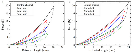 Force-retraction curves for TangoPlus actuator with different position of the channel without external load (a) and with additional 50 g, applied on the free end of the specimen (b). Solid curves represent loading; dashed curves are obtained during unloading.