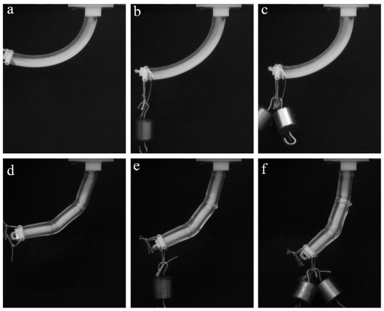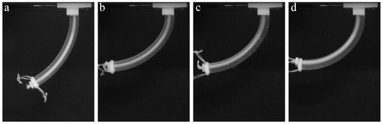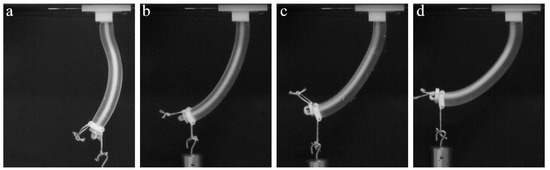 Here, we consider the mechanical behavior of a soft actuator, which contains periodic stiff inclusions on one of the sides. In contrast to the former case, in which inserts and notches are mainly exploited to separate the different sections of the specimen, the continuous pattern of the stiff inserts/inclusions introduces anisotropy through the whole length of the actuator. Here, we consider the stiff inclusions in the shape of elongated platelets, which are located on one side of the actuator. This architecture resembles an imbricated scale pattern in fish (Figure 2f) [40]. Figure 9a–c shows the snapshots, which were obtained during experiments on the “scaled” composite actuator. While the homogeneous FLX9760 actuator with a 150 g weight attached to the free end buckles near the fixed point (Figure 8b), the addition of the scales prevents such buckling, even in the actuator, which is made of much softer TangoPlus material (Figure 9a–c). Moreover, the deformed shape is characterized by uniform curvature throughout the actuator. Therefore, the addition of the periodic patterns allows one to change mechanical behavior and increase the applied maximal load without compromising the flexibility of the actuator. This observation may be important for practical applications in which actuators are required to maintain defined shapes.