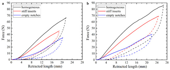 Force-retraction curves for the homogeneous FLX9760 actuator and actuators with empty notches and stiff inserts without external load (a) and with additional 150 g weight on the free end of the specimen (b).