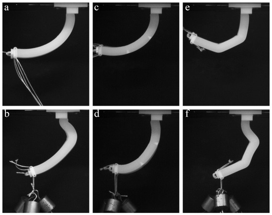 Experimental snapshots for homogeneous FLX9760 actuator (a,b), actuators with stiff inserts (c,d) and empty notches (e,f). Top row corresponds to deformed state without external loading and retraction length 19 mm. Bottom row corresponds to retraction length of 22 mm, while additional 150 g weight was applied on the free end of the actuator.