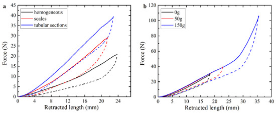 Force-retraction curves for the homogeneous TangoPlus actuator, the actuator with stiff scales, and the actuator with tubular concentric inserts around channel under additional 50 g weight on free end (a). Force-retraction curves for the actuator with tubular concentric inserts with different weights attached to the free end of the specimen (b).