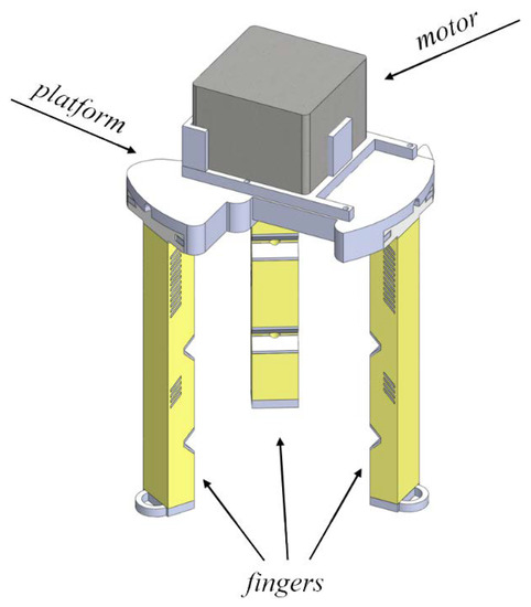 Design of the fully 3D-printed gripper with three equally spaced soft fingers and stepper motor at the top.