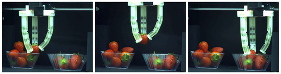 A wide variety of robotics grippers, which are capable of manipulating small and large objects, were proposed in the existing literature [41]. They employ a variety of the actuation approaches, ranging from simple external motors [42] to electroactive polymers [43] and shape memory alloys [44]. Depending on the maturity of the underlying technology, the corresponding grippers have already reached commercialization, either in the beginning or end of their development path. However, regardless of the actuation approach, we demonstrated before, the actuator performance can be tailored by the smart choice of geometry and materials. Therefore, based on the previously shown strategy to combine a soft matrix with stiff inserts and the smart choice of geometry, we developed the gripper shown in Figure 12. This gripper consists of three sectioned actuators, shown in Figure 11, which are driven simultaneously by one Nema17 stepper motor, located on the top part. Three cables are passed through the fingers and connected to the shaft of the motor on the top, leading to the simultaneous deformation of the actuators during rotation of the motor. An alternative design with a separate motor for each finger is possible. It provides better manipulation and simultaneously increases the complexity of the control. The gripper is mounted on the platform of a conventional FDM 3D-printer, which allows us to control its vertical and horizontal movements, as well as its gripping motion through existing 3D-printing software (Repetier). Figure 13 shows the sequential process of delivering a strawberry from one bowl to another (Video S1 in Supporting Materials). This particular gripper is able to consistently lift objects with a weight of 50 g. In order to produce a gripper capable of lifting heavier objects, stiffer base materials or other architecture needs to be applied. Although this soft gripper is able to lift only relatively light objects, this design has a hidden advantage. In particular, due to the low bending stiffness of the structure, retraction of the cable does not cause a significant increase in the gripper holding force, thus providing a very gentle grip. Indeed, if the weight exceeds the potential of the gripper, local buckling near the fixed end of the actuator will occur, as shown in Figure 8b, and the gripped object will not be deformed and/or damaged. In conventional “stiff” grippers, an additional feedback loop is required in order to achieve the same behavior, whereas in soft actuators this behavior is the essential part of their mechanics.