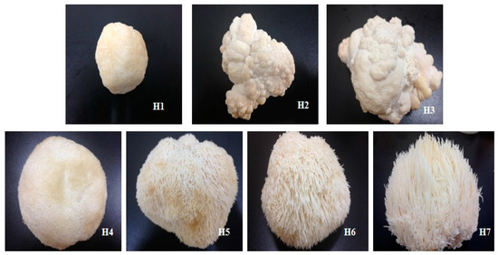 H. erinaceus was cultivated by Shanghai Guosen Biotechnology Co. Ltd. (Shanghai, China) with polypropylene bags containing the sterilized solid media (%, w/w): sawdust 30, corncob 16, cottonseed hull 22, wheat bran 15, corn starch 5, rice bran 10, and plaster 2. Mycelium was inoculated and kept in the dark at 25 °C and 90% relative humidity for 30 days, and laid on a ventilated field for 7 days. After germination, the fruiting bodies were harvested in seven stages of maturity: H1 (bud-forming stage), H2 (small lump stage), H3 (split stage), H4 (small fungal spine stage), H5 (mid-fungal spine stage), H6 (mature stage), and H7 (post-mature stage) (Figure 1).