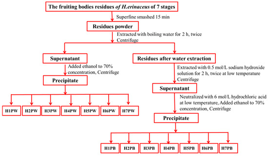 The cell wall polysaccharide was prepared from H. erinaceus fruiting bodies residues after water extraction at seven developmental stages, as shown in Figure 2. The air-dried residues (30 g) after extraction at seven stages were further ground for 15 min to break cell walls, and added to distilled water at a solid-to-solvent ratio of 1:20 and extracted at 100 °C for 2 h twice [24]. The supernatant was collected by centrifugation (15,317× g, 15 min), concentrated by evaporation under reduced pressure, and precipitated with ethanol to reach a final concentration of 70% at 4 °C for 12 h. Seven water-soluble cell wall polysaccharides were obtained after dialysis (3500 Da, 24 h) and freeze drying, and designated as H1PW, H2PW, H3PW, H4PW, H5PW, H6PW and H7PW. After hot water extraction, the residue powders (30 g) were further used for extraction with 0.5 mol/L sodium hydroxide solution with a solid-to-solvent ratio of 1:20 at 4 °C for 2 h twice. The supernatant was collected by centrifugation (15,317× g, 15 min), neutralized with 6 mol/L hydrochloric acid, concentrated by evaporation under reduced pressure, and precipitated with ethanol to reach a final concentration of 70% at 4 °C for 12 h. Seven alkali-soluble cell wall polysaccharides (H1PB, H2PB, H3PB, H4PB, H5PB, H6PB, and H7PB) were obtained after dialysis (3500 Da, 24 h) and were freeze dried and designated.