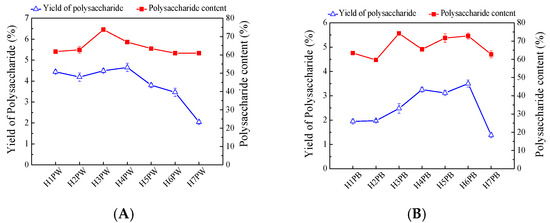 The water- and alkali-soluble cell wall polysaccharides were extracted from the H. erinaceus residues at different developmental stages with hot water (100 °C) and alkali and precipitated by 70% ethanol, successively. As shown in Figure 3A, yields of the water-soluble cell wall polysaccharides significantly increased at the fourth stage, which reached 4.65%, and gradually decreased to 2.04% at stage H7. The maximum water-soluble cell wall polysaccharide content of 73.74% appeared at stage H3, with those of other stages being approximately 60% (Figure 3A).