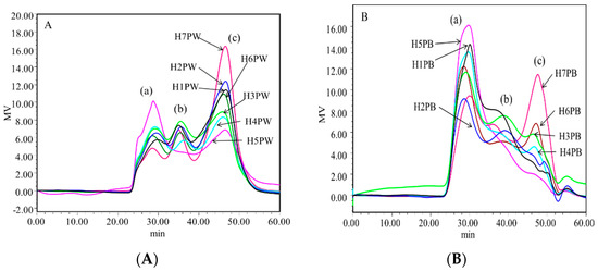 Molecular weight distributions of 14 polysaccharides of H. erinaceus are shown in Figure 4. The molecular weight and distribution trends of the cell wall polysaccharides at seven growth and development stages of H. erinaceus were similar, but the proportion of each fraction was significantly different. Each water-soluble (H1PW, H2PW, H3PW, H4PW, H5PW, H6PW, and H7PW) and alkali-soluble polysaccharide (H1PB, H2PB, H3PB, H4PB, H5PB, H6PB, and H7PB) was a polysaccharide mixture with three fraction peaks shown in HPLC chromatograms labeled as Peaks a, b, and c. By calculating with Astra data analysis software, the molecular weights and percentages of Peaks a, b, and c of 14 polysaccharides are summarized in Table 1. The molecular weight of peak a in water-soluble cell wall polysaccharides ranged from 8.77 × 106 to 1.98 × 107. The percentages of this fraction increased from 23.2% to 47.7% from stages H1 to H5, and then decreased to 19.2% in H7. The molecular weight of peaks b and c varied from 1.73 × 106 to 3.85 × 106, and from 3.17 × 105 to 8.13 × 105, respectively. The percentages of peak b in water-soluble cell wall polysaccharides were generally lower than those of peaks a and c. Table 1 also shows that the percentages of cell wall polysaccharides with lower molecular weight (peaks b and c) had higher levels in the early growth stages (H1 and H2) and later stages (H6 and H7), while having lower levels in maturity stages H3–H5. This indicates that the early growth stages had insufficient sources to synthesize the high-molecular-weight polysaccharides, while high-molecular-weight polysaccharides were synthesized as the energetic storage in the H4–H5 stages, then being broken down to a low-molecular-weight fraction for cell maintenance in the later stages.