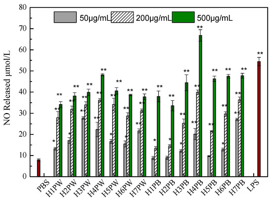 Macrophage activation was evaluated by NO production using the Griess method [26]. Mouse macrophages (RAW264.7), purchased from the American Type Culture Collection (ATCC, Manassas, VA, USA), were cultured in Dulbecco’s Modified Eagle’s medium (DMEM) containing 100 U/mL penicillin, 100 μg/mL streptomycin, and 10% fetal bovine serum (FBS) at 37 °C in a 5% CO2 humidified atmosphere. Aliquots (180 μL) of a RAW264.7 cell suspension (5 × 105 cells/mL) were dispensed into each well of a 96-well plate together with 20 μL of the different test agents incubated at 37 °C for 48 h. Supernatants (100 μL) were reacted with 50 μL Griess reagent at room temperature for 10 min [22], and NO production was determined by measuring the absorbance at 543 nm using NaNO2 as the standard. The samples were previously dissolved in PBS at various concentrations (50, 200, and 500 μg/mL) before the tests. PBS and lipopolysaccharide (1 μg/mL) served as negative and positive controls, respectively.