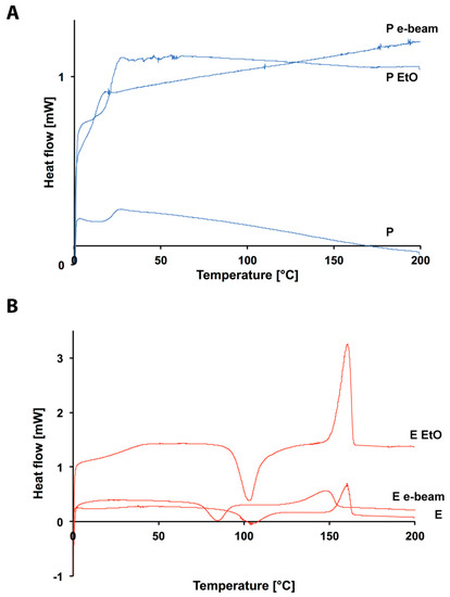 DSC curves of: (A) P, P EtO and P e-beam (blue lines); (B) E, E EtO and E e-beam (red lines).