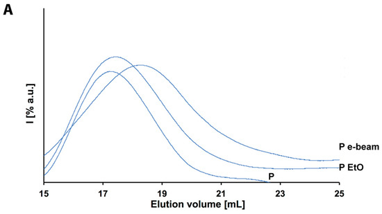 Though relatively expensive, EtO processing is widely used for the sterilization of medical devices and surgical instruments and it basically consists of a controlled exposure of the products to EtO in gaseous form, in a sealed chamber. The high diffusivity of EtO, coupled with its high reactivity, is of major importance for the inactivation of microorganisms. In fact, EtO can penetrate selected packaging and access all the exposed surfaces of the product. Moreover, it works as an alkylating agent for protein essential for cell reproduction, DNA, and RNA. This way, it prevents normal cellular metabolism and the ability to reproduce of the affected microbes, which becomes nonviable [24]. In general, the chemical species targeted by EtO are not included in most of the medical devices’ composition, therefore, their exposure to EtO should have very little or no impact on them, independently of their physical characteristics. On the other hand, the whole process is performed at mid-high temperature and relatively high humidity, both parameters that might affect the polymer initial fashions. Indeed, though not great changes are recorded in the physical characteristics of the polymers (DSC in Figure 3, NMR in Figure S3 and XRD in Figure S4 in S.I.), still a statistically relevant albeit small reduction of the molecular weights is recorded for both of them (Table 1). As a matter of fact, the Mw of polymer E moves from 119,609 to 96,000 Da, with a change in PD of 0.013, whereas the one of polymer P shifts from 172,746 to 159,413 Da with a PD variation of 0.04 (Figure 4). Though these changes might not be an effect of the EtO directly, it is anyhow rather important to record the inevitable degradation effect given by the whole sterilization protocol.