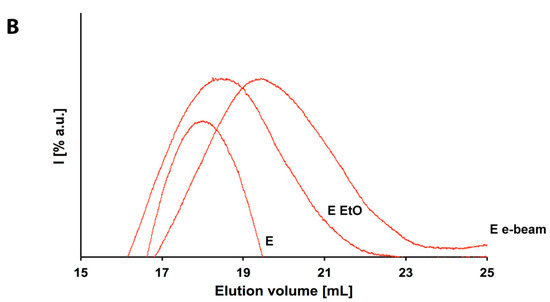 GPC chromatograms of: (A) P, P EtO and P e-beam (blue lines); (B) E, E EtO and E e-beam (red lines).