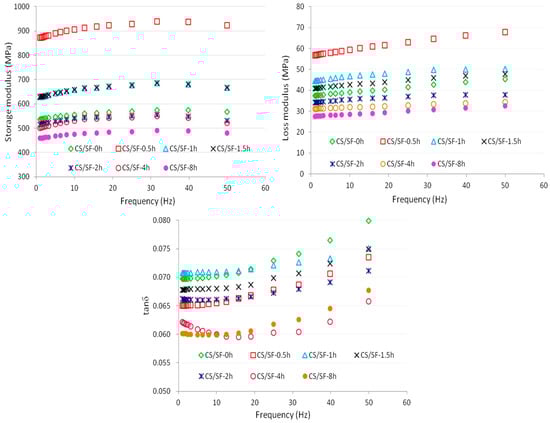 The storage modulus (G′), loss modulus (G″), and tan δ of the CS/SFs with different ball grinding times as a function of frequency are listed in Figure 2. The loss modulus (G″) and tan δ of the CS/SFs increased as the frequency increased; however, the storage modulus (G′) slightly decreased after the increase. This may be due to the fact that as the frequency increases to 40–50 Hz, the loading speed changes faster, which leads to the elastic relax of the film not being completed in a short time; then, a small amount of energy is absorbed by the film, that is, elastic hysteresis occurs. A similar tendency is also found in Figure 3, which illustrates the storage modulus (G′), loss modulus (G″), and tan δ of the CS/SFs with different addition amounts as a function of the frequency. The values of G′ are much higher than those of G″ in the entire frequency range, which indicates that the CS/SFs showed dominant elastic behavior compared to viscous behavior [].