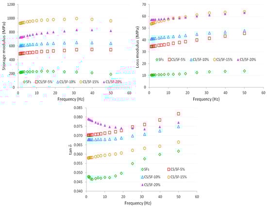 Storage modulus, loss modulus, and tan δ versus frequency curves of the CS/SFs with different addition amounts.