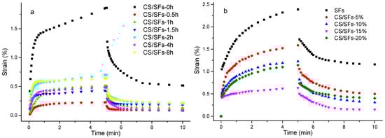 Creep-recovery versus time curves of the CS/SF with different ball grinding times (a) and different addition amounts (b).
