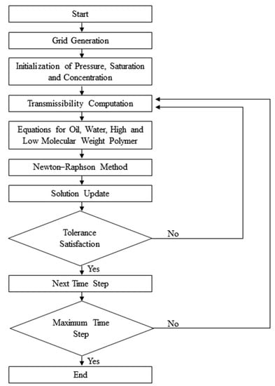 Equations (24)–(27) constitute a system of nonlinear equations. To ensure the stability of computation, the full implicit method was applied to solve the nonlinear equations. For the solution of each specific time step, the Newton-Raphson method, an iterative method, was used. The solution flow chart is shown in Figure 3. More details can be found in Chen’s works [,]. Finally, pressure was obtained along with production, oil, and water phase saturation distribution, as well as the high and low molecular weight polymer concentrations.