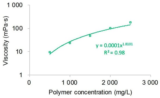 The relationship between the viscosity of the polymer solution and polymer concentration is presented in Figure 4. Clearly, relationship shows a good power law relationship, and the square of the correlation coefficient (R2) reached 0.98. Their relationship expression can be written as: