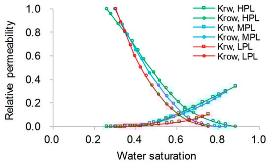 where is the flow rate of phase , which can be calculated by Peaceman’s well model []; is the grid coordinate of a well; is the concentration of the component ; represents the oil or water phase, represents the oil phase; represents the water phase; represents the high or low molecular weight polymer; represents the high molecular weight polymer; and represents the low molecular weight polymer.
