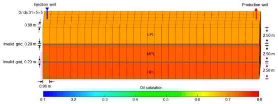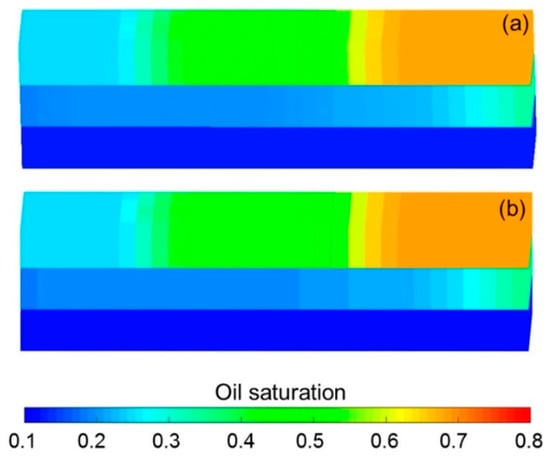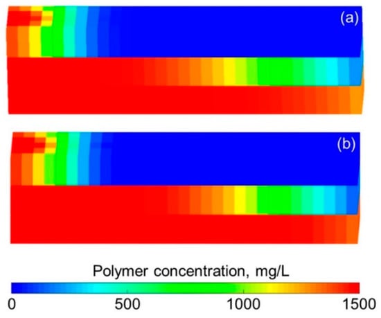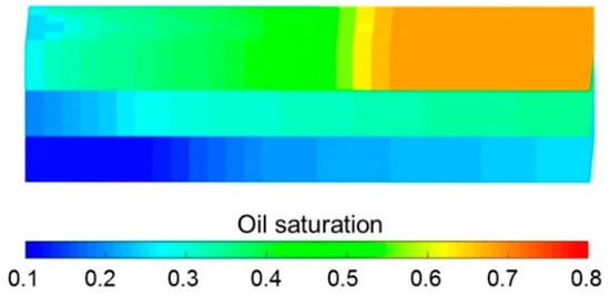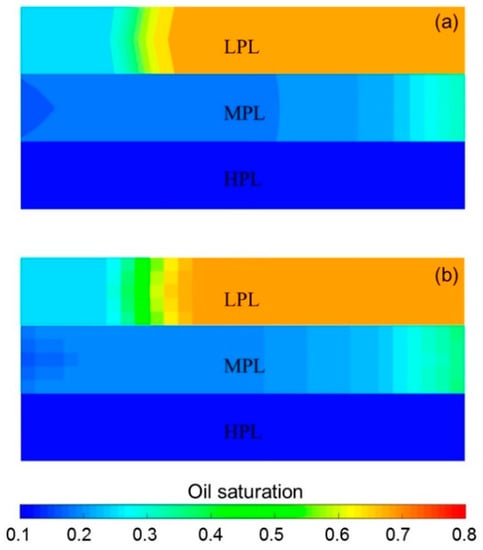 Some parameters, including the reservoir properties, fluid properties, relative permeabilities, and initial conditions, were the same as those in the case for validation without polymer degradation, not repeatedly presented here. The different parameters for the experimental simulation from the validation case without polymer degradation are provided in Table 6. The comparative results of the pressure difference, oil production, water production, water cut, cumulative oil production, and oil recovery are indicated in Figure 12. This figure reveals that the simulation result was close to the experimental result. There were differences of 1.00% in water cut and 1.70% in oil recovery after a cumulative injection volume of 1.67 PV, and differences of only 0.08% in water cut and 2.07% in oil recovery were recorded when a 4.8 PV cumulative injection volume was used. Figure 13 illustrates the 3D high molecular weight, low molecular weight, and total polymer concentration distributions after injection of 0.64 PV polymer solution, and at 120 days after injection of 0.64 PV polymer solution by the designed simulator. Figure 13 shows that the high molecular weight polymer concentration decreased, which means that the high molecular weight polymer degraded. The high and low molecular weight polymer concentrations near the injection well were about 1499.50 mg/L and 0.50 mg/L, respectively, after injection of 0.64 PV polymer solution because the dynamic degradation time of the high molecular weight polymer was only 0.175 days, which is a very short time. Then, the high molecular weight polymer concentration near the injection well decreased to about 1218 mg/L, and the low molecular weight polymer concentration near the injection well increased to about 282 mg/L at 120 days after injection of 0.64 PV polymer solution. The average first-order degradation rate constant was about 0.0017 day−1, which is close to the first-order static degradation rate constant. This value agreed well with the fact that the polymer static degradation was dominant before the beginning of the subsequent water flooding in the polymer flooding experiment. It proved that the polymer static and dynamic degradation were described well in the designed simulator. Moreover, the total polymer concentration near the injection well remained at nearly 1500 mg/L during the 120 days. This demonstrated that the polymer degradation did not cause a change in the total polymer concentration, which is consistent with polymer theory. Additionally, the actual oil saturation distributions of each layer were examined by the saturation detector after the 0.64 PV polymer solution was injected in the experiment, as shown in Figure 14a. Figure 14b presents the oil saturation distribution obtained with the designed simulator. Some tiny differences were observed between the simulations, by comparing these two oil saturation distributions, which can mainly be attributed to the accuracy of the saturation detector, which was limited by laboratory conditions and influenced by the position and number of probes and experimental operations. Nevertheless, from the data obtained for the oil saturation distributions and the change trends in the oil saturation, the results can be also considered similar. Overall, the validation performed with polymer degradation including polymer static and dynamic degradations was positive and acceptable.