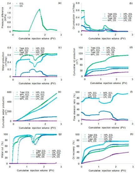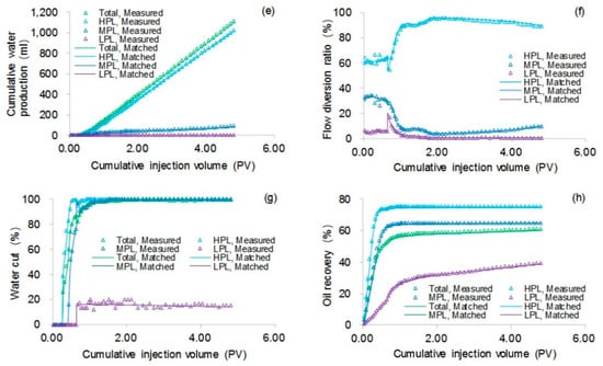 Comparison results in terms of: (a) pressure difference, (b) oil production, (c) water production, (d) cumulative oil production, (e) cumulative water production, (f) flow diversion ratio, (g) water cut, and (h) oil recovery of the polymer flooding experiment obtained by the designed simulator in simulating the polymer flooding experiment.