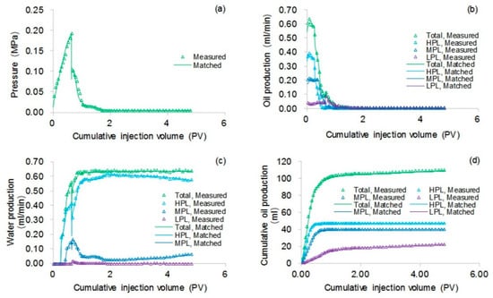 However, no widely accepted commercial software considers polymer degradation [], and conducting simulations with consideration of both polymer static and dynamic degradation was not possible. Therefore, we compared the simulation results of our designed simulator with the data of an actual polymer flooding experiment for validation, where both polymer static and dynamic degradation were considered.