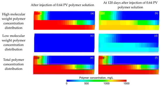 3D (a) high molecular weight, (c) low molecular weight, and (e) total polymer concentration distributions after injection of 0.64 PV polymer solution, and 3D (b) high molecular weight, (d) low molecular weight, and (f) total polymer concentration distributions at 120 days after injection of 0.64 PV polymer solution by the designed simulator in simulating the polymer flooding experiment.