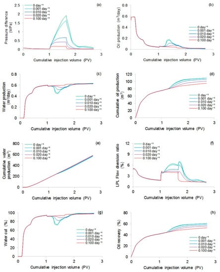 Comparative results for the production indicators including: (a) pressure difference, (b) oil production, (c) water production, (d) cumulative oil production, (e) cumulative water production, (f) LPL flow diversion ratio, (g) water cut, and (h) oil recovery with different first-order dynamic degradation rate constants.