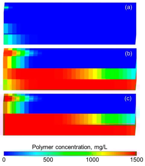 3D (a) high molecular weight, (b) low molecular weight, and (c) total polymer concentration distributions after cumulative injection volume of 1.67 PV of the simulation with a first-order dynamic degradation rate constant of 0.100 day−1.