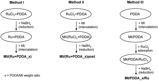 The first step in the synthesis of Mt/PDDA/Ru composites involved preparation of Mt suspension in distilled water (0.5 g clay/100 mL water). The suspension was stirred for 24 h at room temperature to enhance Mt exfoliation. Next, 0.2 wt % RuCl3 aqueous solution in the amount corresponding to 2 wt % of Ru with respect to Mt component, was mixed with different amounts of 0.05 wt % PDDA aqueous solution for 1 h and reduced with excess NaBH4 methanolic solution (molar ratio NaBH4/Ru = 100). The mixture was added drop-wise to the Mt suspension at room temperature and left under stirring for 24 h. Then the product was retrieved and washed free of Cl- by centrifugation till negative reaction of the supernatant with AgNO3, and stored as aqueous gel. This procedure is referred to as method I. Samples prepared this way, are denoted Mt/(Ru + PDDA_x), where x is the PDDA/Mt weight ratio, equal 0.01, 0.025, 0.05, 0.1, or 0.25. Theoretically, the complete cation exchange requires the PDDA/Mt weight ratio of 0.14. For the sake of comparison, additional samples with PDDA/Mt ratio of 0.05 and 0.25 were obtained, by changing the sequence of synthetic steps. Thus, in method II, the preparative route followed the path of method I, except that the reduction with NaBH4 was carried out in a post-synthesis manner, in the final stage of the composite manufacturing. The resulting two samples are referred to as Mt/(Ru + PDDA_x)post. In method III the Mt component was first intercalated with polycations by mixing with the PDDA solution and stirred for 24 h. Subsequently, the resulting Mt/PDDA_x complex was mixed with RuCl3·xH2O aqueous solution (2 wt % of Ru with respect to Mt) for 24 h and the whole mixture subjected to reduction with NaBH4. The samples obtained this way are referred to as Mt/PDDA_x/Ru. The main steps of each procedure are illustrated in Figure 1.