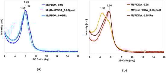 The effect of Ru insertion by method II and III on XRD pattern of organomontmorillonite was studied for two levels of PDDA loadings, x = 0.05, and x = 0.25, and is shown in Figure 4a,b, respectively. In the former case, the XRD diagrams of Ru-containing composites do not differ in any significant manner from that of Mt/PDDA_0.05 sample, suggesting a similar manner of polymer packing in all samples. For x = 0.25, addition of ruthenium by method II causes, similarly as in the case of method I, evolution, next to the peak corresponding to d001 = 1.56 nm, of a reflection associated with d001 = 1.97 nm, indicative of clay intercalated by a double layer of polymer. Thus, for the XRD-detectable structural order it is irrelevant whether Ru added to the polymer solution is reduced prior to (method I) or after (method II) intercalation. Application of method III to Ru insertion does not affect the XRD pattern of the parent Mt/PDDA samples in any meaningful way.