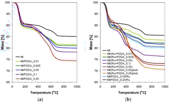 The weight loss in the TG curves of PDDA–montmorillonite complexes occurs in two major temperature ranges, below and above ca. 200 °C (Figure 6a). In the parent montmorillonite the weight loss below 200 °C is associated with the departure of interlayer water coordinating exchangeable Na+ ions, with a minor contribution from physisorbed water held in interparticle pores. The weight loss in the range 200–700 °C is due to dehydroxylation of montmorillonite layers reflected in the departure of water. It should be noted that the phenomena responsible for both steps overlap to some extent and there is no clear-cut border between them [31]. Thermal degradation/combustion of the organic component in PDDA-containing samples occurs above 200 °C and overlaps with the dehydroxylation of clay mineral layers. Table 1 provides the values of the observed weight losses in the temperature range 200–1000 °C for all samples whose TG profiles are presented in Figure 6a,b. The theoretical weight losses, estimated under the assumption that all introduced polymer has been incorporated into the sample, are given in brackets. For all samples, except of those with the highest employed PDDA/Mt ratio of 0.25, the experimental values remain within the ±15% margin from the theoretical ones, which, bearing in mind that the end of the clay dehydration step may extend above the arbitrary limit of 200 °C, indicates that practically all PDDA enters the montmorillonite structure (Table 1). This is the case even for the Mt/PDDA_0.01 sample, with the lowest PDDA loading, corresponding to ca. 7% of the clay CEC, and demonstrates the high affinity of the polycation towards the clay matrix. In the case of samples with PDDA/Mt ratio of 0.25, the amount of added PDDA corresponds to ca. 180% of CEC, therefore Table 1 provides also information of the theoretical mass loss expected if the PDDA content in the composite is less than the added total and corresponds to the maximum CEC-allowable value. It may be seen that for Mt/PDDA_0.25 and Mt/PDDA_0.25/Ru samples, in which Ru-free PDDA solution was used for intercalation, the observed weight loss indicates that the samples retain less than the introduced amount of PDDA, close to the CEC dependent value, the excess being apparently removed upon washing. In contrast, in Mt/(Ru + PDDA_0.25) and Mt/(Ru + PDDA_0.25)post samples, in which intercalated PDDA solution contained either Ru particles or RuCl3, the amount of incorporated PDDA is higher, suggesting that in the presence of Ru species more PDDA can be loaded into the clay matrix. In both materials the stage of final washing of the sample comes after the formation of Ru nanoparticles. Possibly, the polymer interacting with Ru nanoparticles is more rigid and less prone to removal upon washing than that present in the Ru-free system. The presence of larger amount of polymer also explains the appearance of a bilayer PDDA packing in these samples, evidenced by XRD (Figure 2b and Figure 4b).