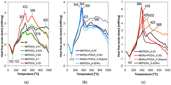 Valuable information as to the nature of the interaction between the components of the composites, depending on the method of Ru insertion, can be derived from the analysis of DSC profiles (Figure 7). In parent Mt (Figure 7a), the endotherm peaking near 110 °C accompanies the release of interlayer water associated with the compensating cations, the endotherm at 678 °C is due to the dehydroxylation of the montmorillonite layers, and a small S-shaped endo-exotherm centered around 900 °C indicates structural rearrangements accompanying the formation of new phases. With addition of PDDA component, new maxima of exothermic character appear, at 360, 423, and 588 °C (Figure 7a). As expected, their intensity increases with the amount of added polymer. The first two are attributed to the decomposition/combustion of PDDA, the third is attributed to the combustion of the carbonaceous deposit formed during incomplete oxidation of the organic matter at the previous stage of polymer destruction.