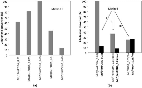The results of the catalytic tests of 2-butanone hydrogenation carried out in this work are summarized in Figure 9. Figure 9a shows the dependence of 2-butanone conversion for the series of catalysts obtained by method I, differing in the polymer/clay weight ratio. No conversion of 2-butanone was observed on parent Mt or an organoclay not containing ruthenium. It is apparent that the highest activity (100% conversion) is obtained over the Mt/(Ru + PDDA_0.05) catalyst with an intermediate polymer content. It has been repeatedly demonstrated by theoretical and experimental studies that maximum catalytic activity in various processes catalyzed by Ru nanoparticles can be achieved by optimization of the particle size, so as to obtain the highest population of the active sites favorable for the catalytic transformation [34,35,36]. In the present work, the physicochemical characterization revealed that Ru particle sizes in this series vary in the 2–4 nm range, showing a tendency to become smaller upon increase of the relative polymer content. The maximum activity observed for the catalyst with intermediate PDDA loading, hence intermediate Ru particle dimensions, may be taken as an indication that also in the present study the size of Ru species plays an important role. However, it appears that it is not the only factor influencing the catalytic activity. Figure 9a shows that a particularly rapid fall of activity occurs in materials heavily loaded with PDDA, i.e., Mt/(Ru + PDDA_0.1) and Mt/(Ru + PDDA_0.25). Although in these samples Ru crystallites become smaller, so the fall of activity is in line with the hypothesis of the existence of an optimum Ru crystal size, but it should be remembered that the large volume of polymer present in these materials is likely to hinder the access of reagents to Ru particles. Therefore, the diffusional limitations within the catalyst structure are another probable cause of the observed strong decrease of catalytic activity.
