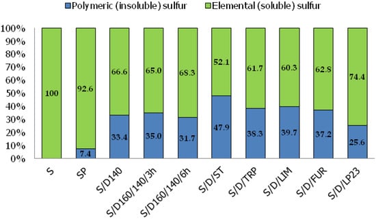 The investigation of a polymeric (insoluble) form of sulfur in sulfur/organic copolymers is crucial to draw conclusions about their behavior and impact during the rubber curing process. As it has been described, the mass ratio of elemental (soluble) and polymeric (insoluble) form of sulfur was investigated according to ASTM D4578 standard in which toluene was used as a solvent for soluble sulfur. The results are reported in